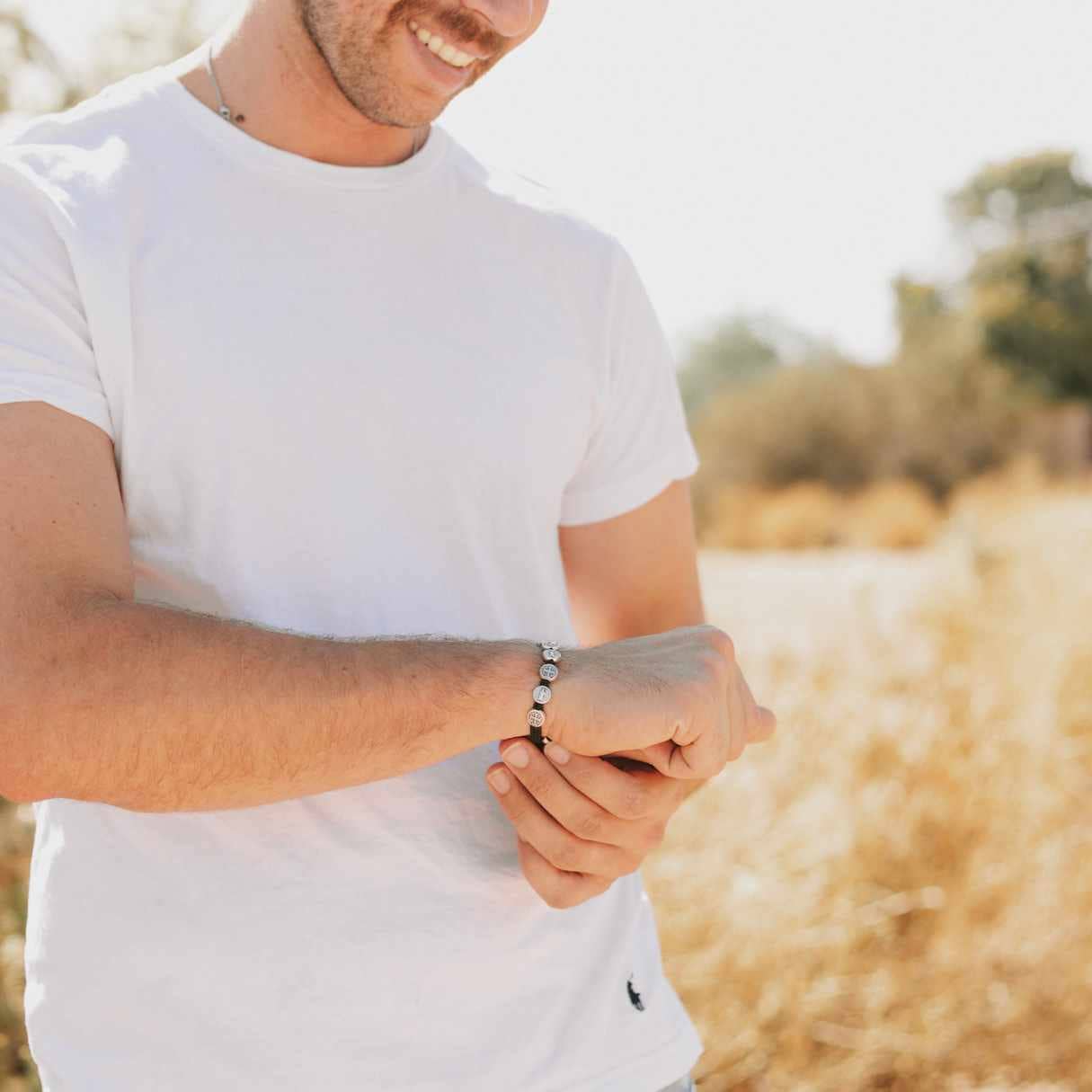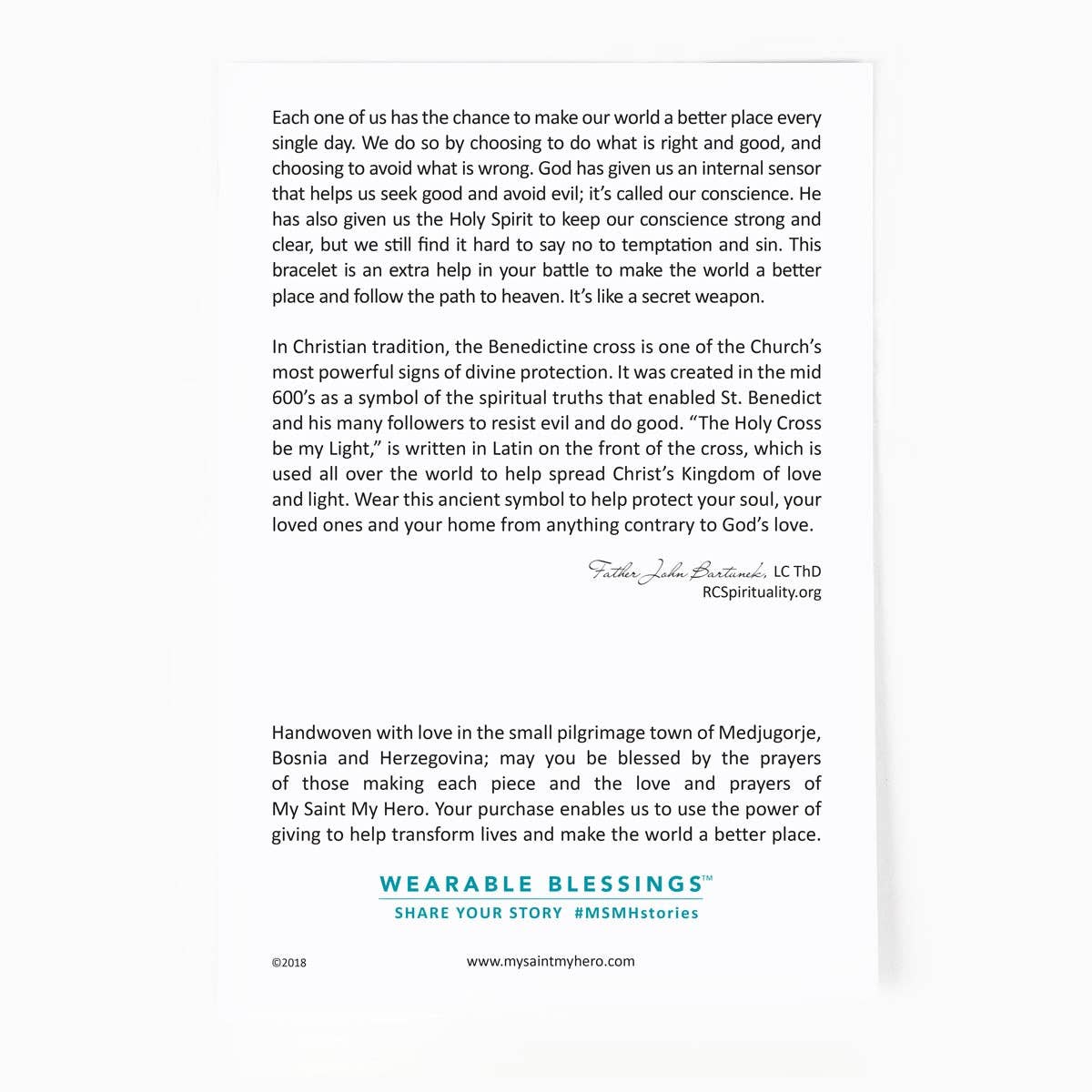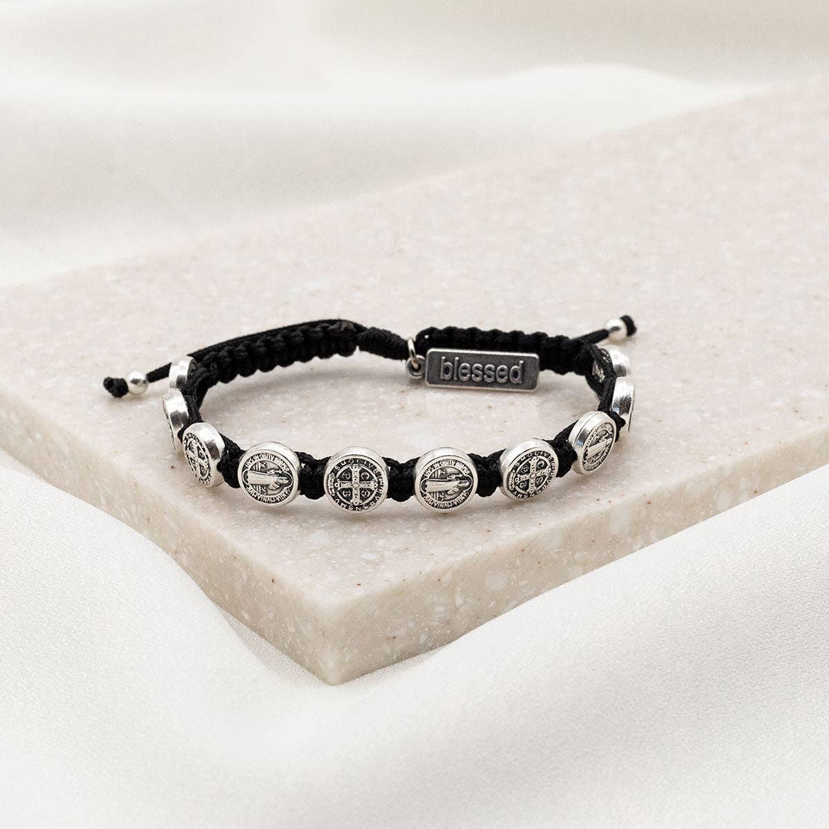 Benedictine Blessing Bracelet for Him - Black / Silver The Blessing Bracelet for Him is sized larger than our other bracelets Adjustable slipknot black cording which opens to 11", closes to 7.25" This protection bracelet is handwoven in Medjugorje, Bosnia and Herzegovina 10 silver tone Benedictine Medals and our signature "blessed" tag Medals hand-cast in Italy Men's Benedictine Blessing Bracelet comes on an inspirational card telling the story of the powerful protection of the Benedictine Medal.