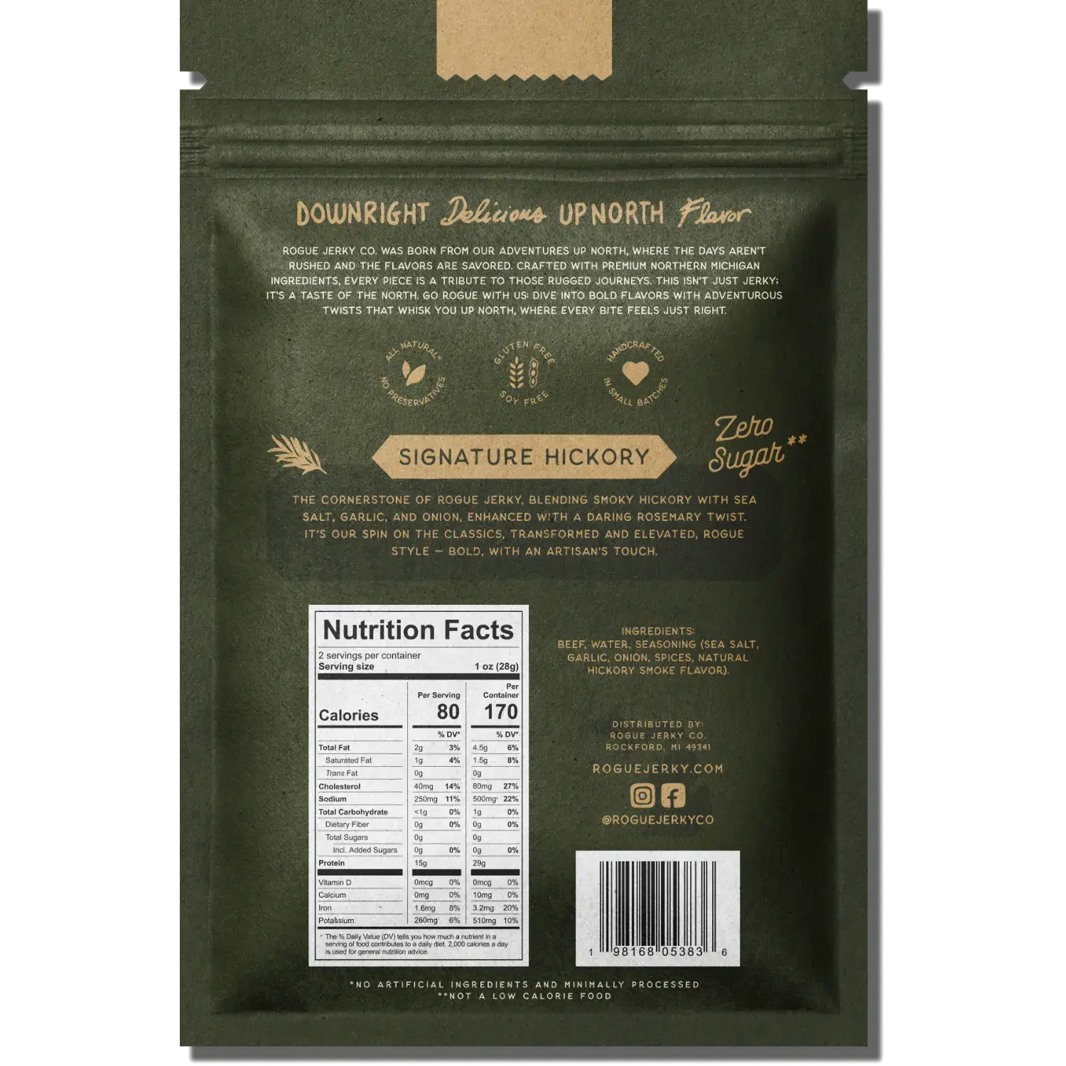 Rogue Jerky Co.’s Signature Hickory Beef Jerky is the cornerstone of our lineup—a timeless flavor elevated with a gourmet twist. We start with premium Angus beef, carefully seasoned with smoky hickory, sea salt, garlic, and onion. Then we add a subtle rosemary note for depth and character, giving this jerky a bold, savory flavor profile that’s both rugged and refined.