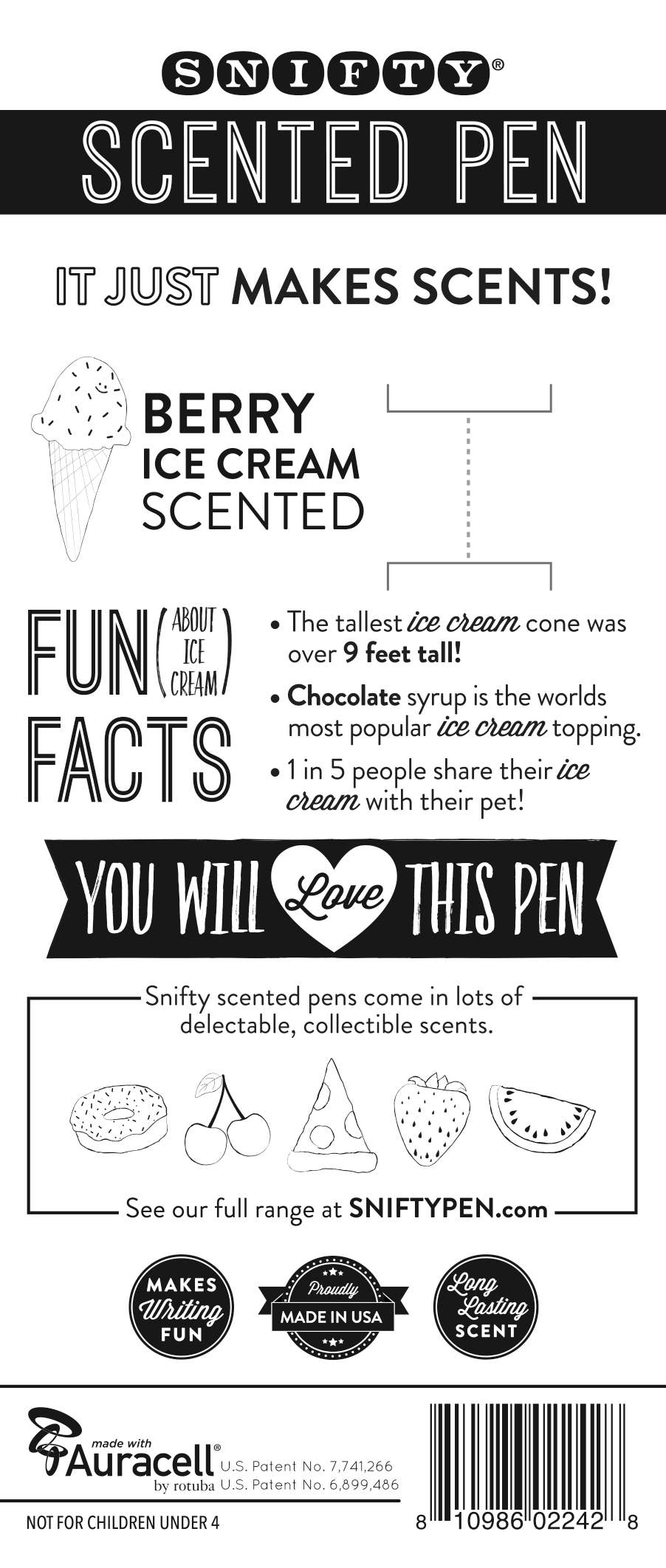 Delicious ICE CREAM Scented Pen! Scented grip and tip, individually wrapped pen on decorated card with scent sample hole. Fun facts on the back! Black ink | 3.5” x 7” SET OF 6