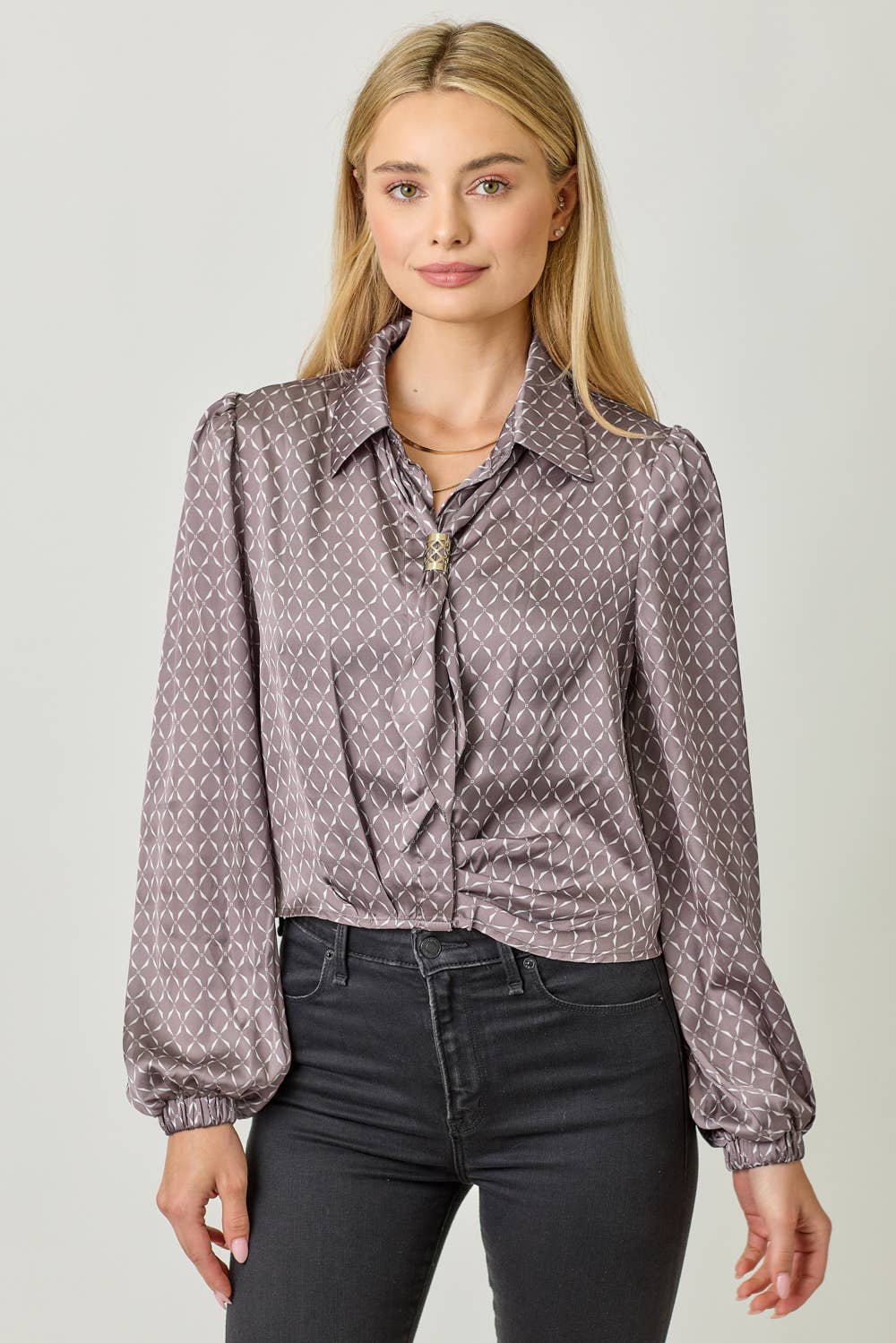 Elevate your style with the Geo Print Scarf Blouse, featuring a sophisticated gold scarf adjuster that adds a touch of luxury and versatility. This unique detail allows you to customize your look effortlessly, making it perfect for both casual outings and elegant occasions. Experience a blend of comfort and chic design that lets you stand out with confidence.
