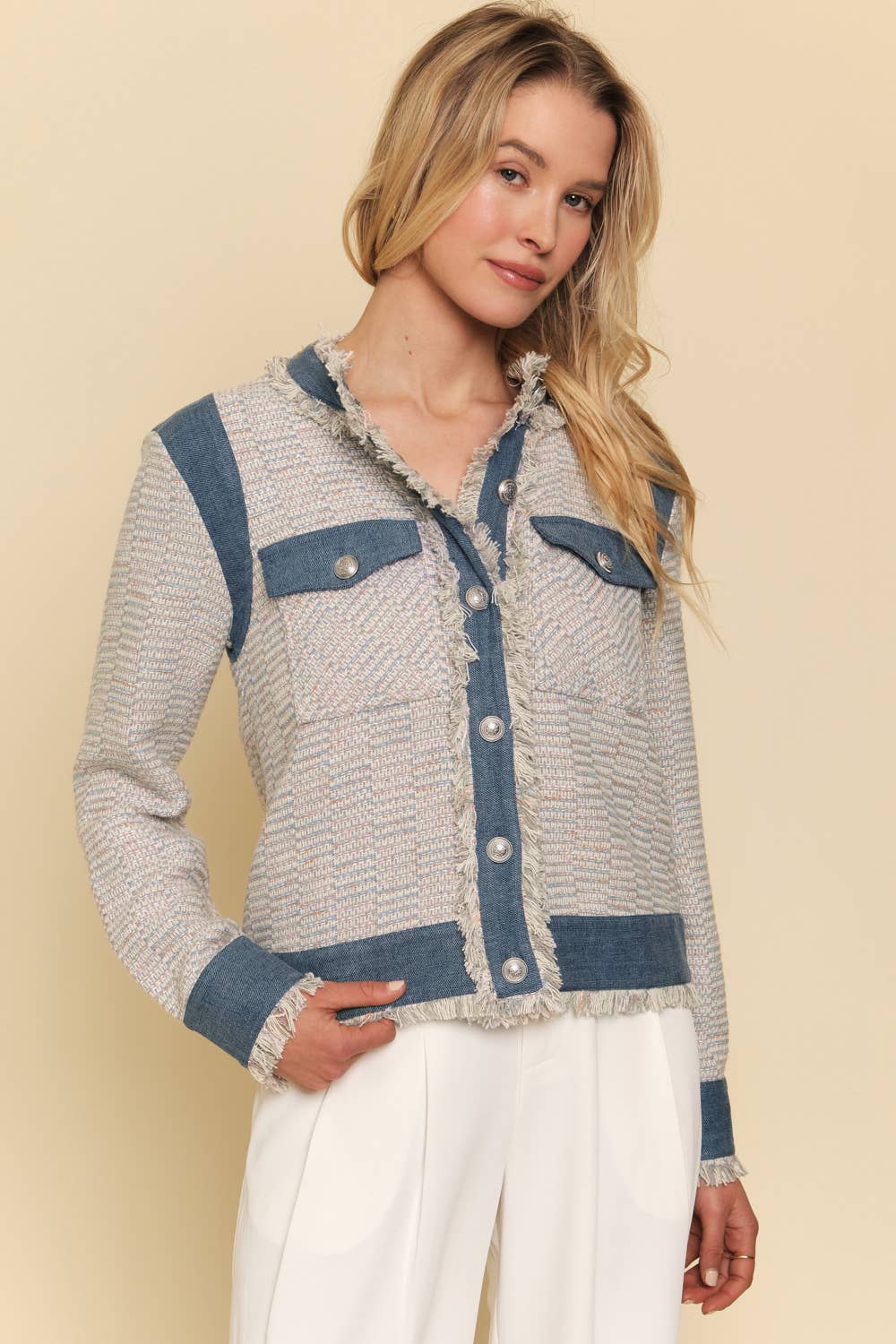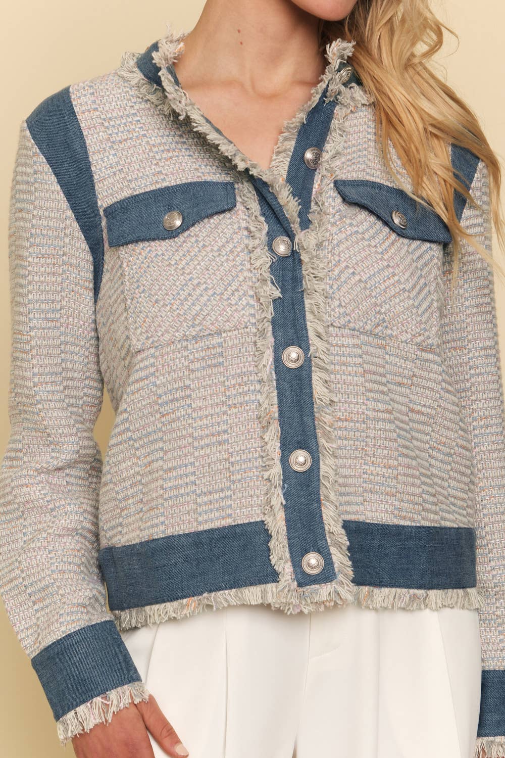 Elevate your style with the Denim Tweed Jacket featuring elegant silver buttons that add a refined touch to its classic design. Crafted for both comfort and durability, this jacket blends timeless tweed texture with contemporary denim accents, making it perfect for versatile layering. The silver buttons not only enhance its sophisticated look but also ensure secure closure, helping you stay polished and confident throughout your day. Ideal for casual outings or smart-casual events, this jacket effortlessly upgrades any wardrobe.