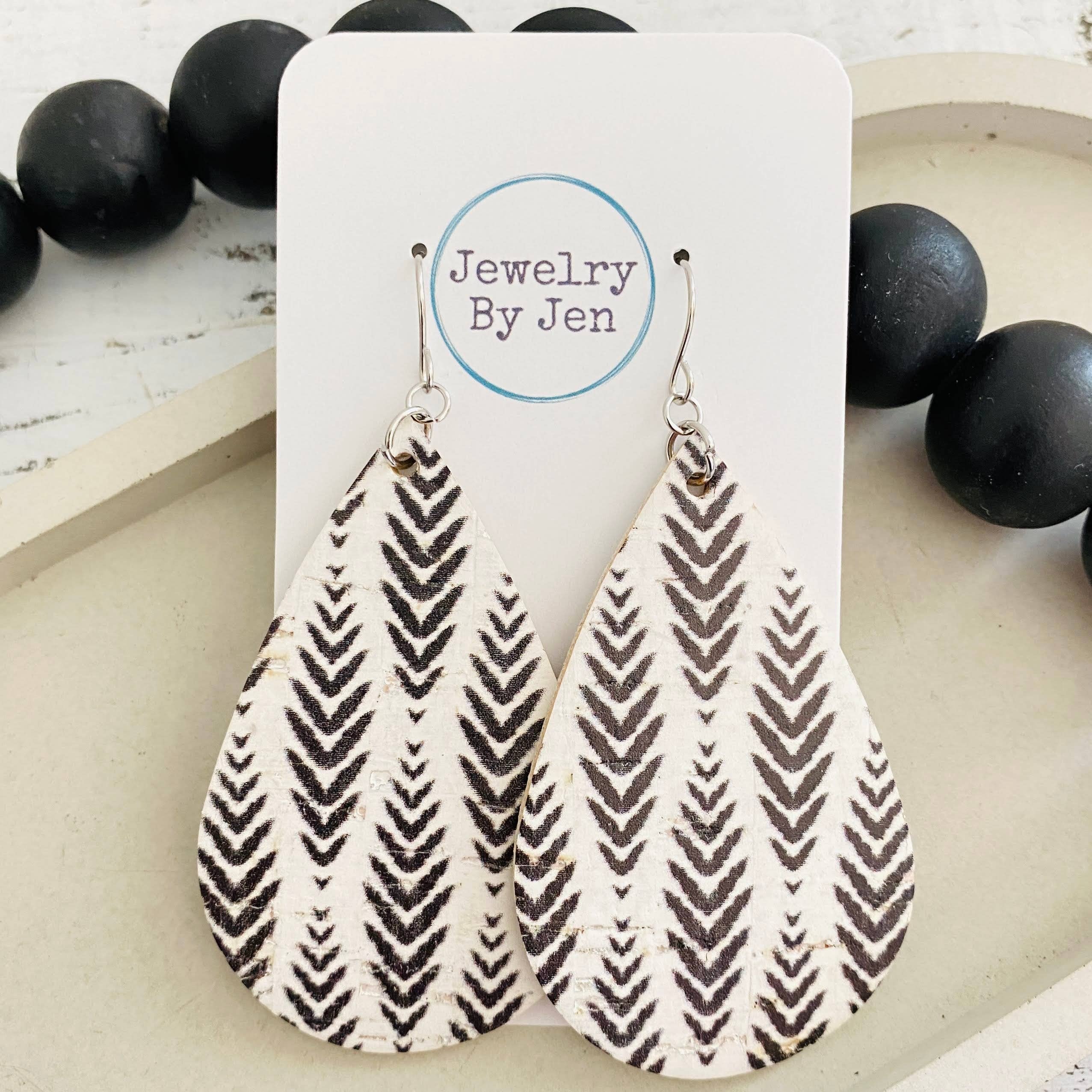 This is a printed cork bonded to a very thick and firm leather. Large Teardrop measures 2 1/4H x 1 3/8W Stainless steel hook