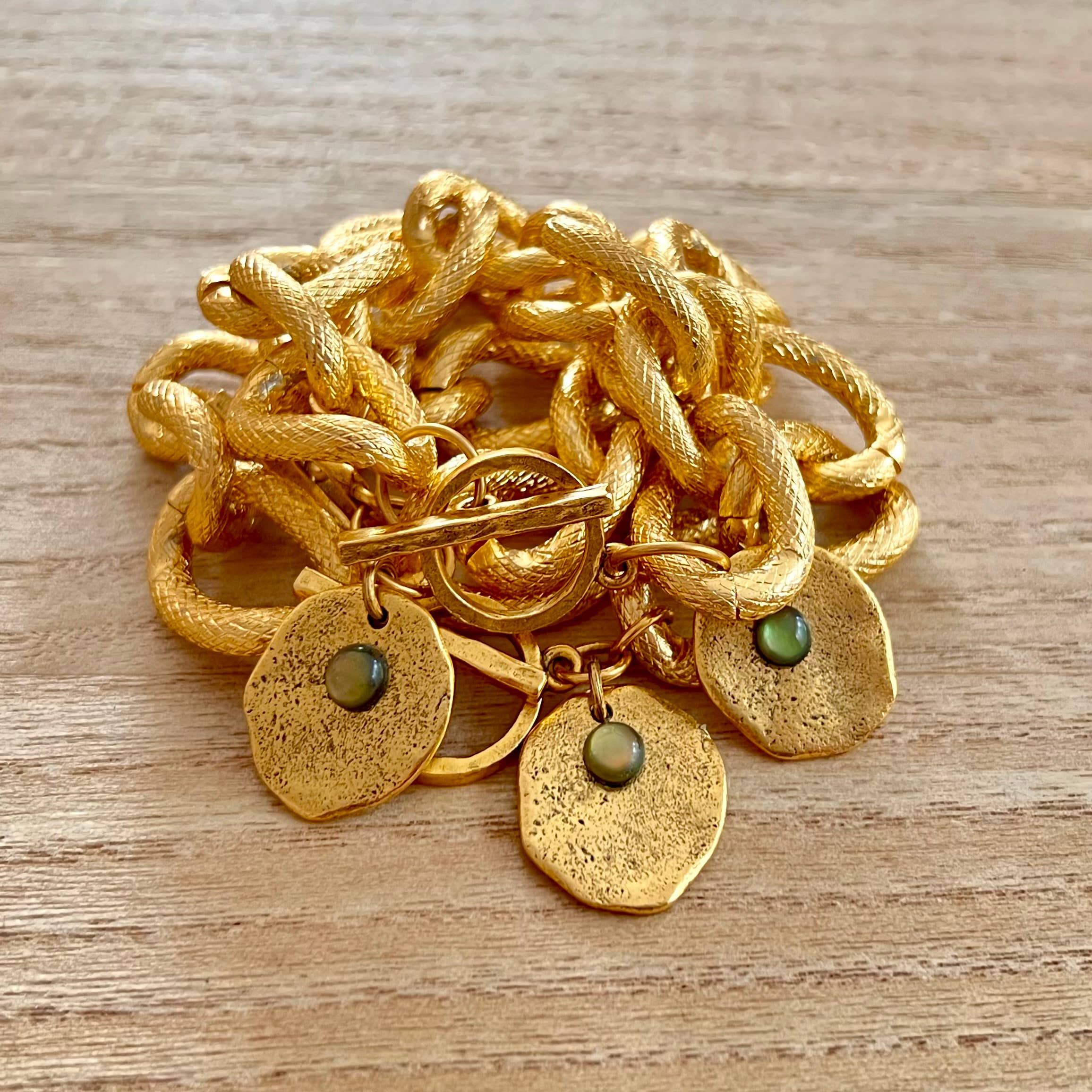 If you're going to be bold, be bodacious. Antique gold finished textured aluminum, antique gold artisan coin, black lip shell, approx. 8”, lightweight. Given the uniqueness of small batch components and availability of gemstones, some variation may occur and will be as close as possible to what is pictured.