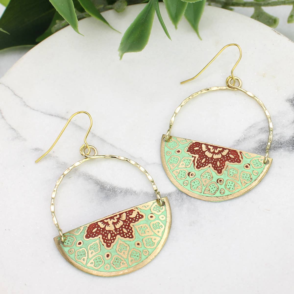 Go global with these colorful embossed earrings that could have come straight from a Moroccan marketplace. Enameled mandala design in half circle hangs from hammered gold wire. An old world look in a modern setting.