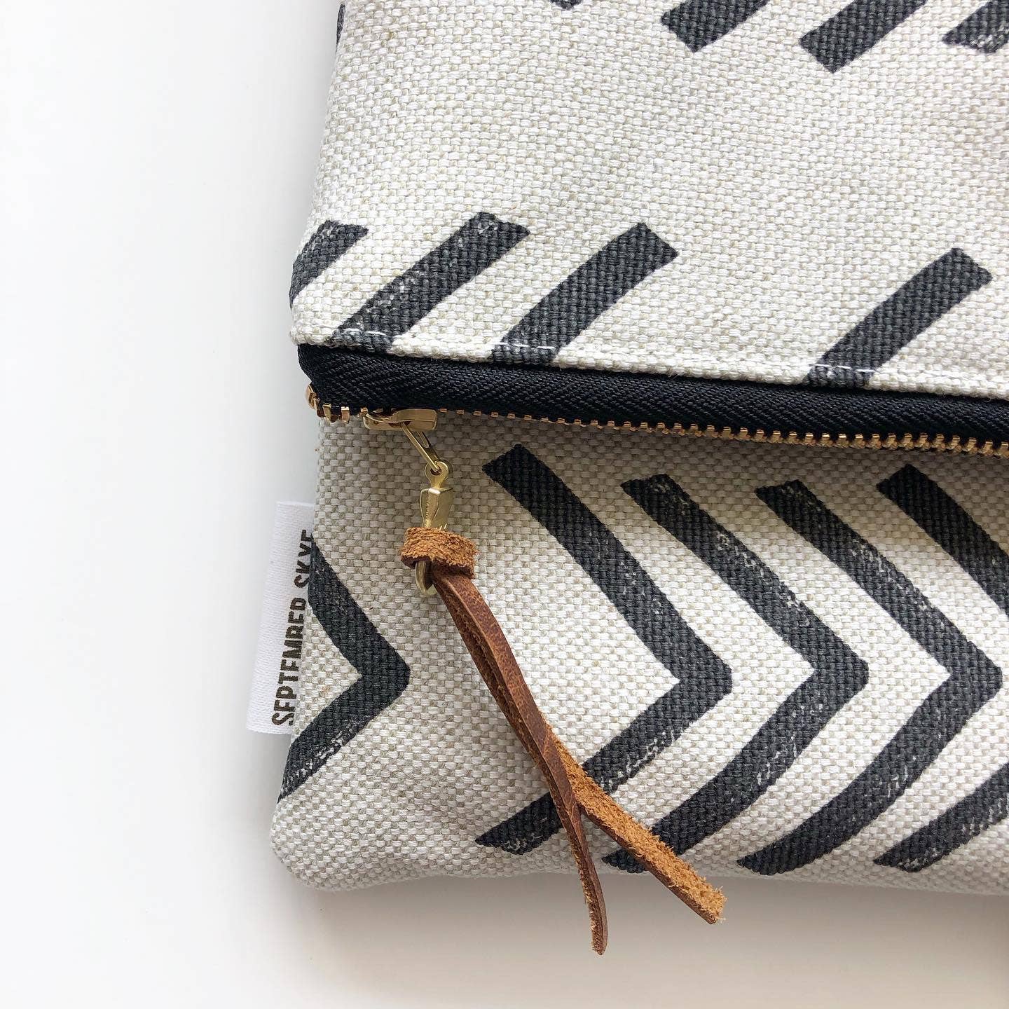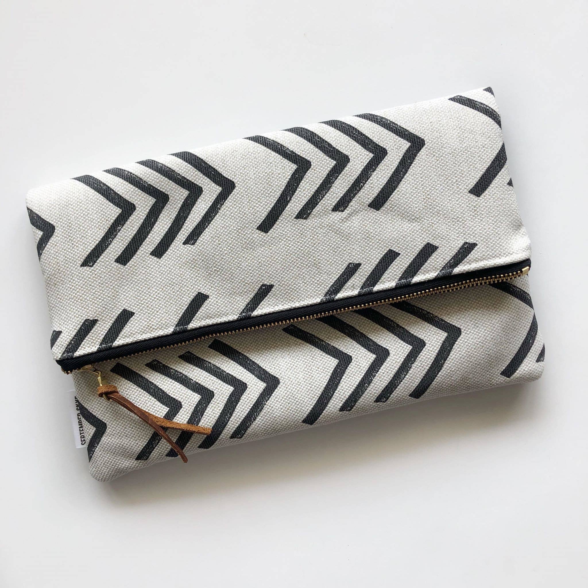 A beautiful, handmade foldover clutch for all those day trips, evenings out or a separate pouch to throw in the diaper bag. It would hold a reasonably sized wallet, phone, lipsticks and more! Specs: 11.5" x 11.5" when flat 11.5" x 7" when folded Heavy cotton fabric Lined with stable interfacing Zipped with sturdy YKK metal zipper Handwash only.