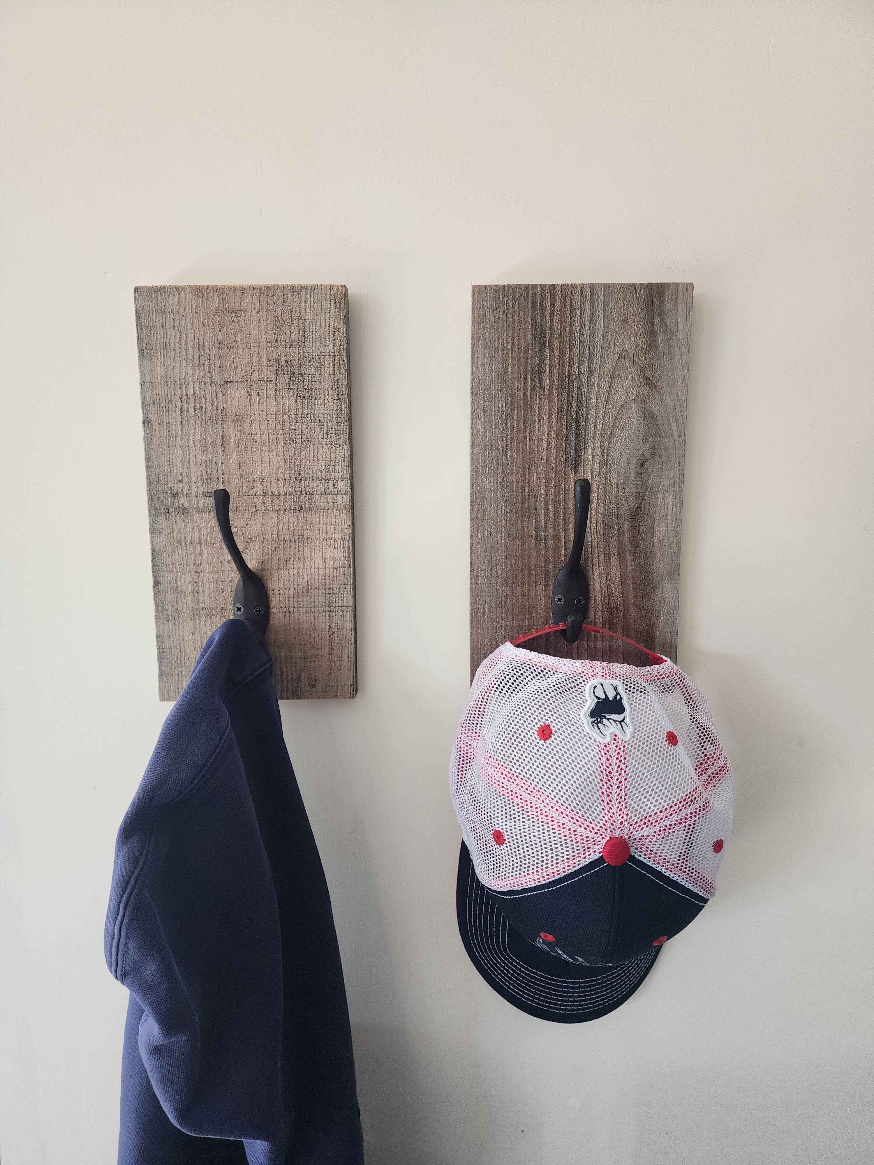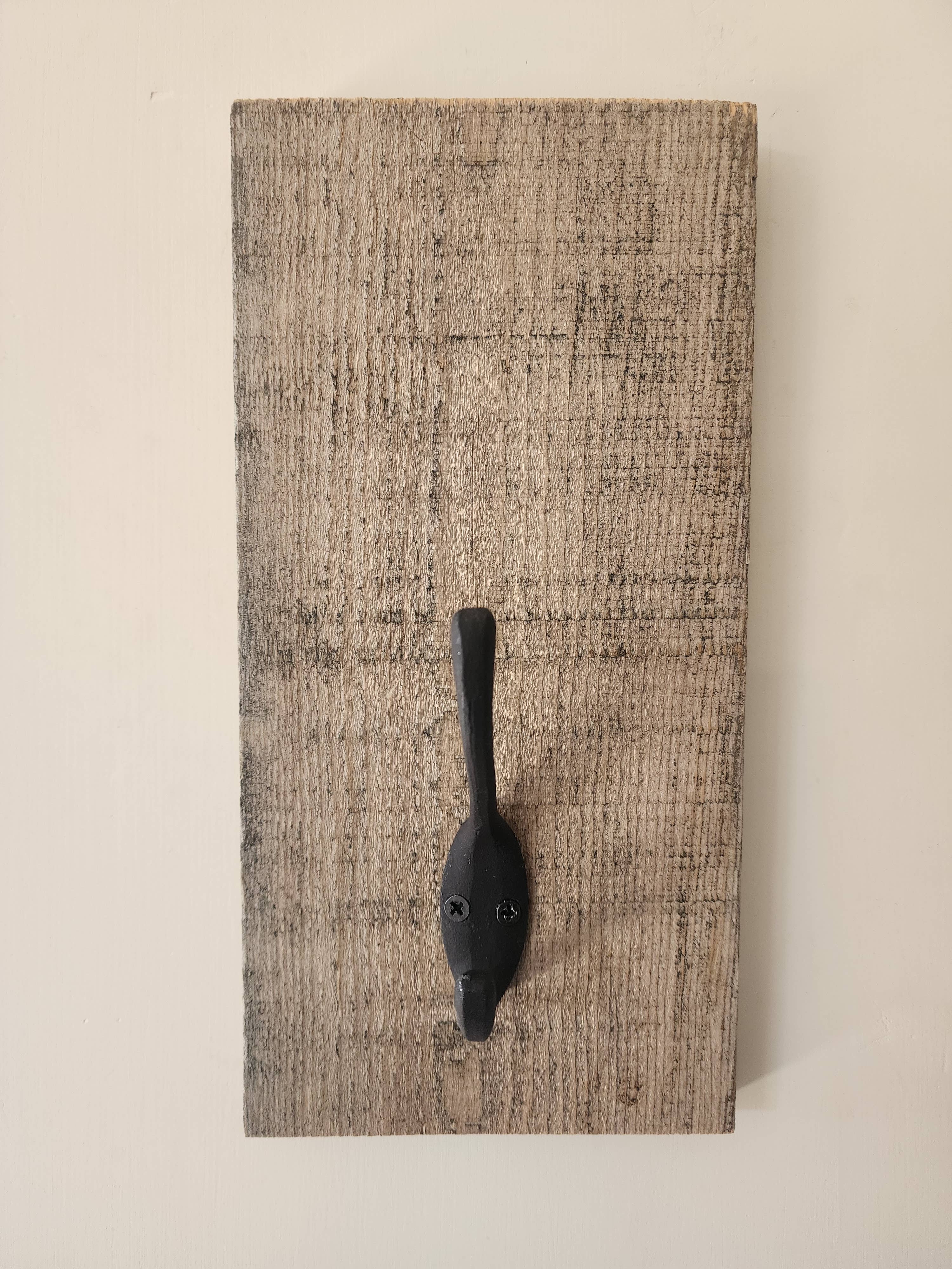 Rustic wall hook made from reclaimed wood. These assembled hooks each measure 11" tall by 5 3/8" wide and are approximately 5/8" thick. Each piece of salvaged wood is naturally rustic and distressed and will vary. The hooks may include small imperfections due to the nature of the salvaged wood. Wood color, grain, and knots will also vary. The rustic aged metal hook that is attached to each piece is 4 1/4" tall and protrudes about 2 1/4" from the surface of the wood for a total of approximately 3" from the wall. Strong enough to hold mugs, keys, hats, purses, leashes, aprons, etc. A metal D ring is pre-attached to the back for easy hanging. Stylish, charming and rustic, these hooks easily blend with any decor.