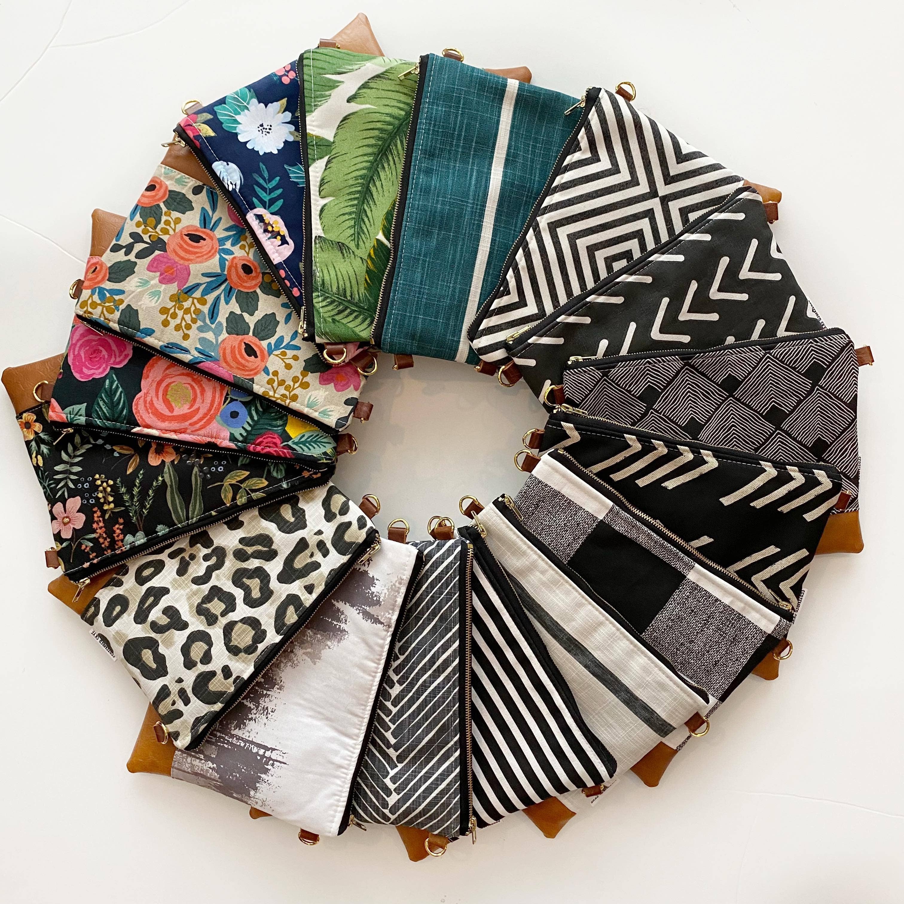 Handmade small crossbody bag with adjustable crossbody strap. Great to pack in a suitcase for traveling when you don't want to take "everything!" The strap can be detached to use as a clutch as itself or a wrist strap can be purchased separately. Faux leather bottom, gold hardware and zipper. Interior will be a coordinating adorable print. Varies on availability. Approx. "8x10" Coordinates great with my other coin purses, mini coin purses and leather accessories.