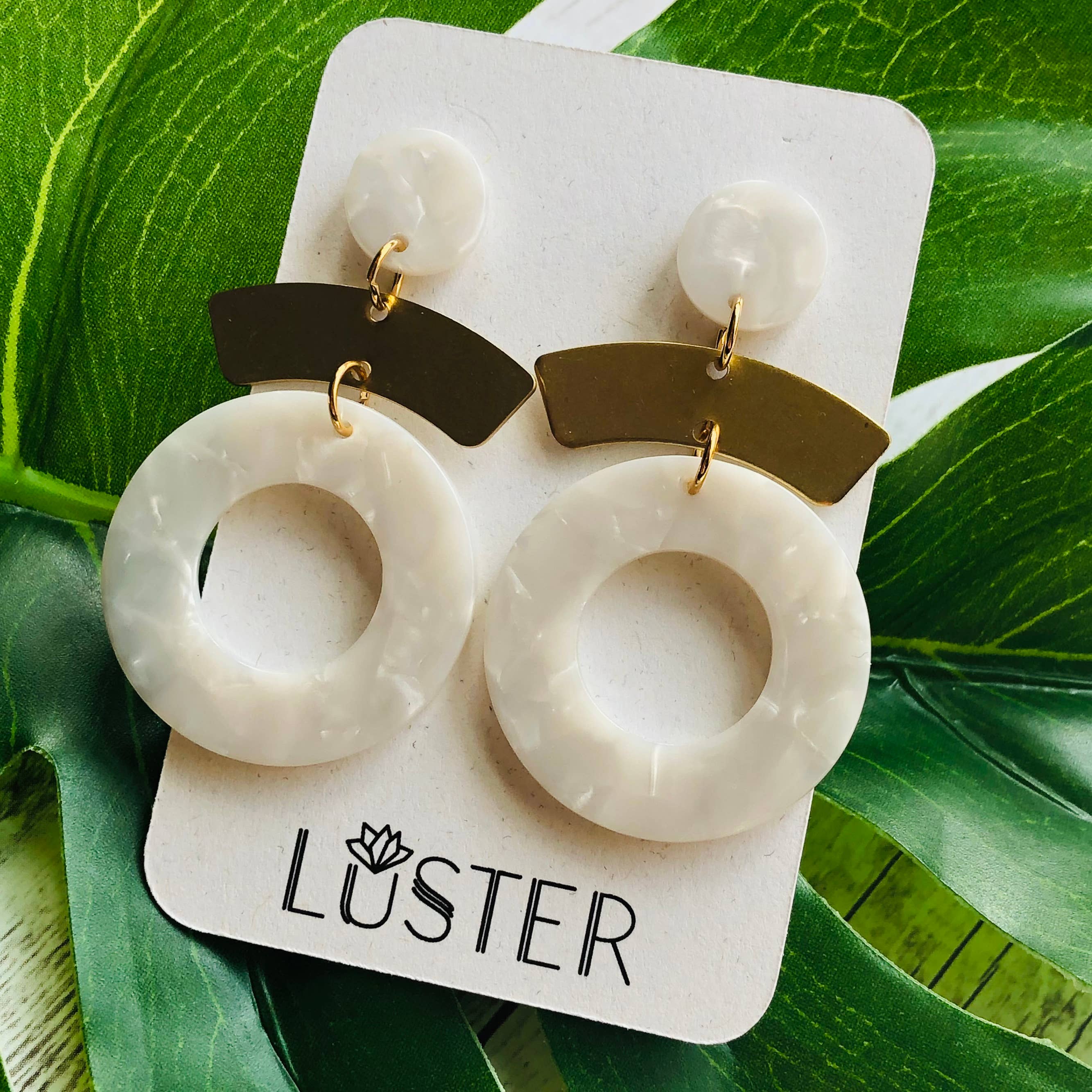 Acetate hoops with brass accents. Surgical steel and acetate posts. Earrings are 2" and very lightweight