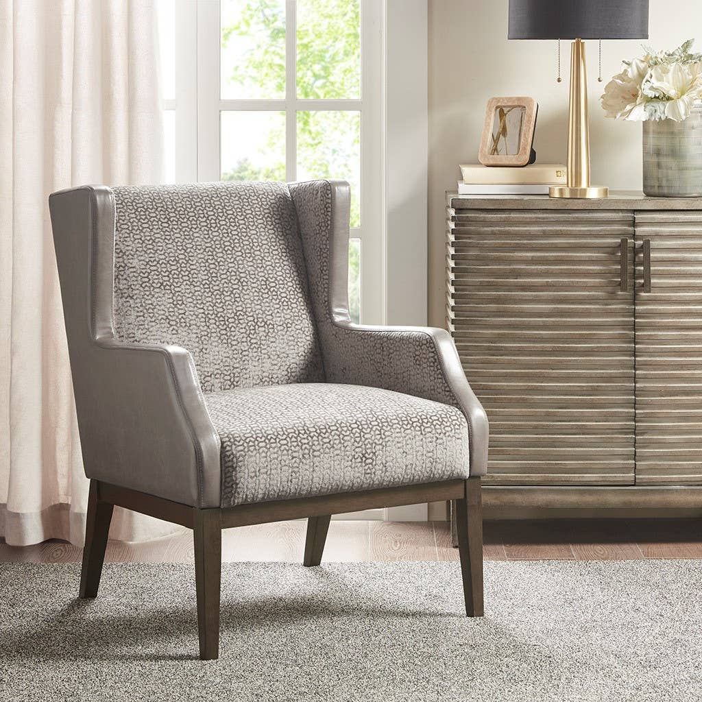 This wing chair features a high back and recessed arms for a traditional allure. The lightly distressed and patterned upholstery adds a lush modern touch to the elegant design. The dark brown wood finish on the solid wood legs creates a beautiful contrast.