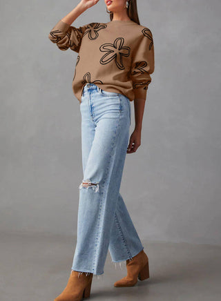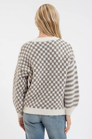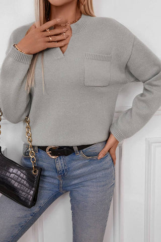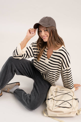 STRIPE SPLIT NECK LONG SLEEVE KNIT SWEATER: BLACK
