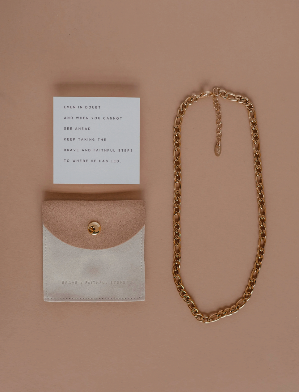 When the war surrounding you leaves you feeling defeated, remember where your strength comes from. Your strength is not by chance, by accident, or by luck; your strength comes from the mighty power of the living God. When the enemy attempts to throw those fiery darts at you, hoping to steer you away from Christ, remember that Christ is your shield. His protection is all powerful, nothing can harm you. “The Lord is my strength and my shield; in him my heart trusts, and I am helped; my heart exults, and with my song I give thanks to him.” Psalm 28:7 ESV Details: Tiny tag with verse reference attached to end of necklace Comes with coordinating pouch + card pictured. 14kt Gold Plated Chain over stainless steel 18 inch chain with 3" extender Waterproof, Hypoallergenic, + Tarnish Resistant