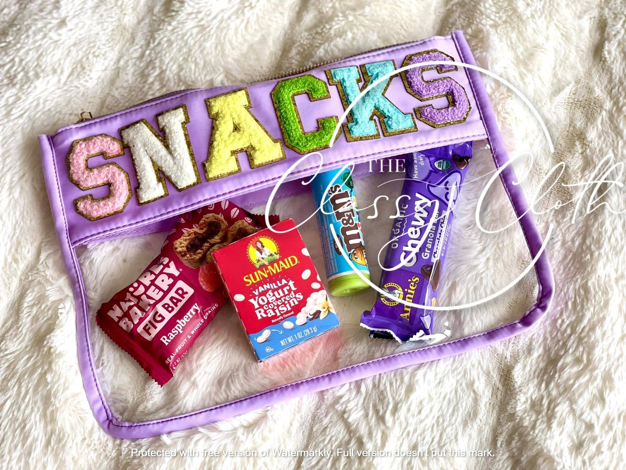 Clear pouch with zip close top and Chenille Letters as pictured! Put all of your must have items inside! Dimensions: 12 inches wide by 8.26 inches high