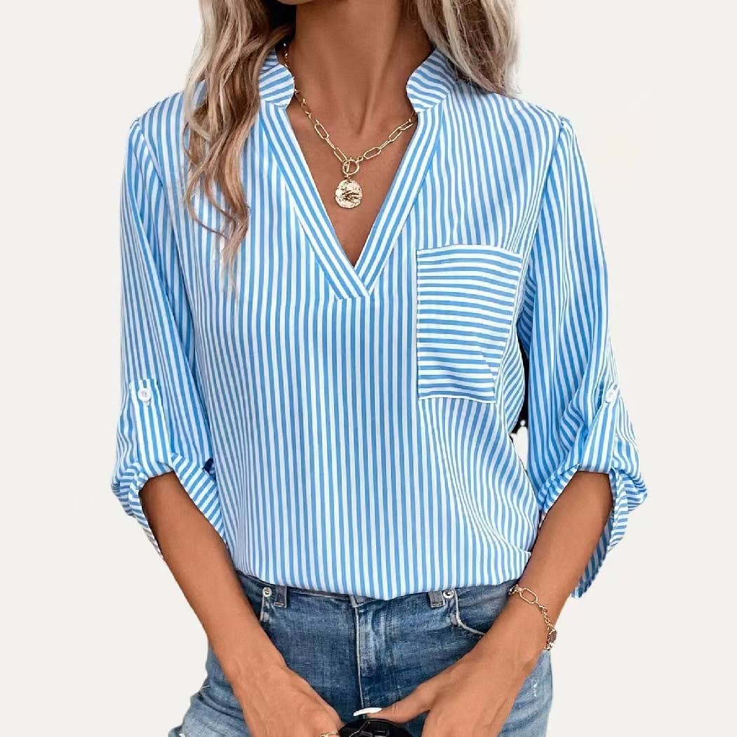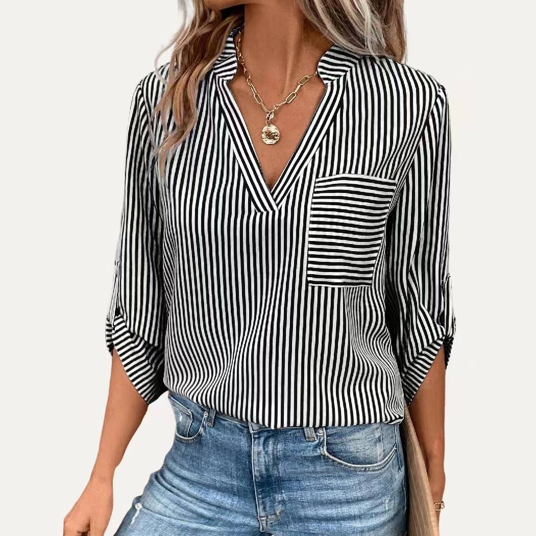 Classic Striped Pattren V Neck Half Sleeve Top: Black / L