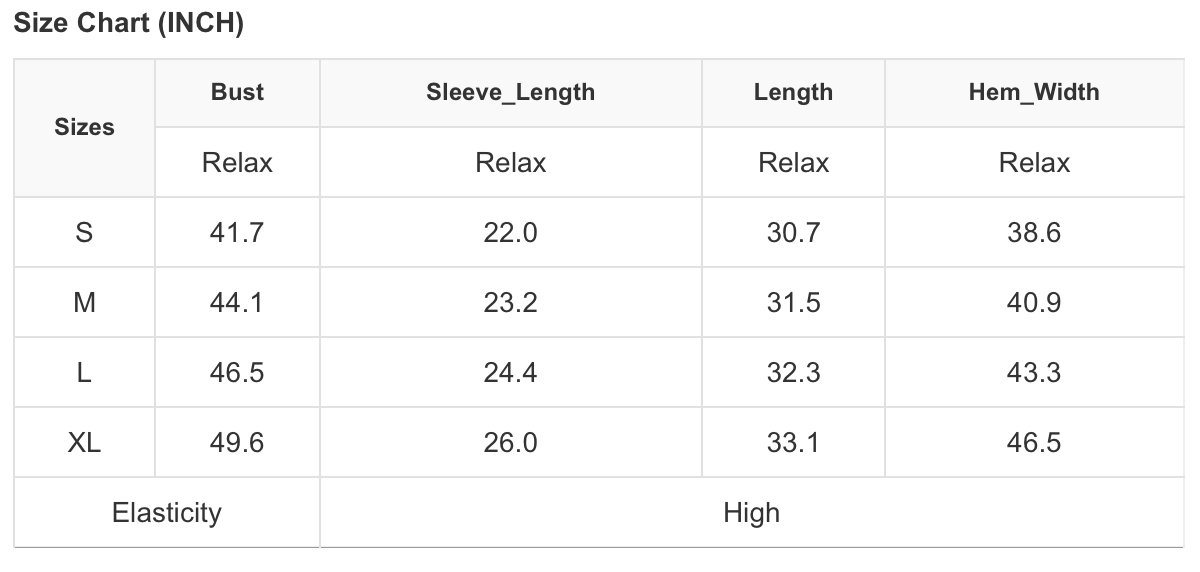 See size chart for approximate measurements