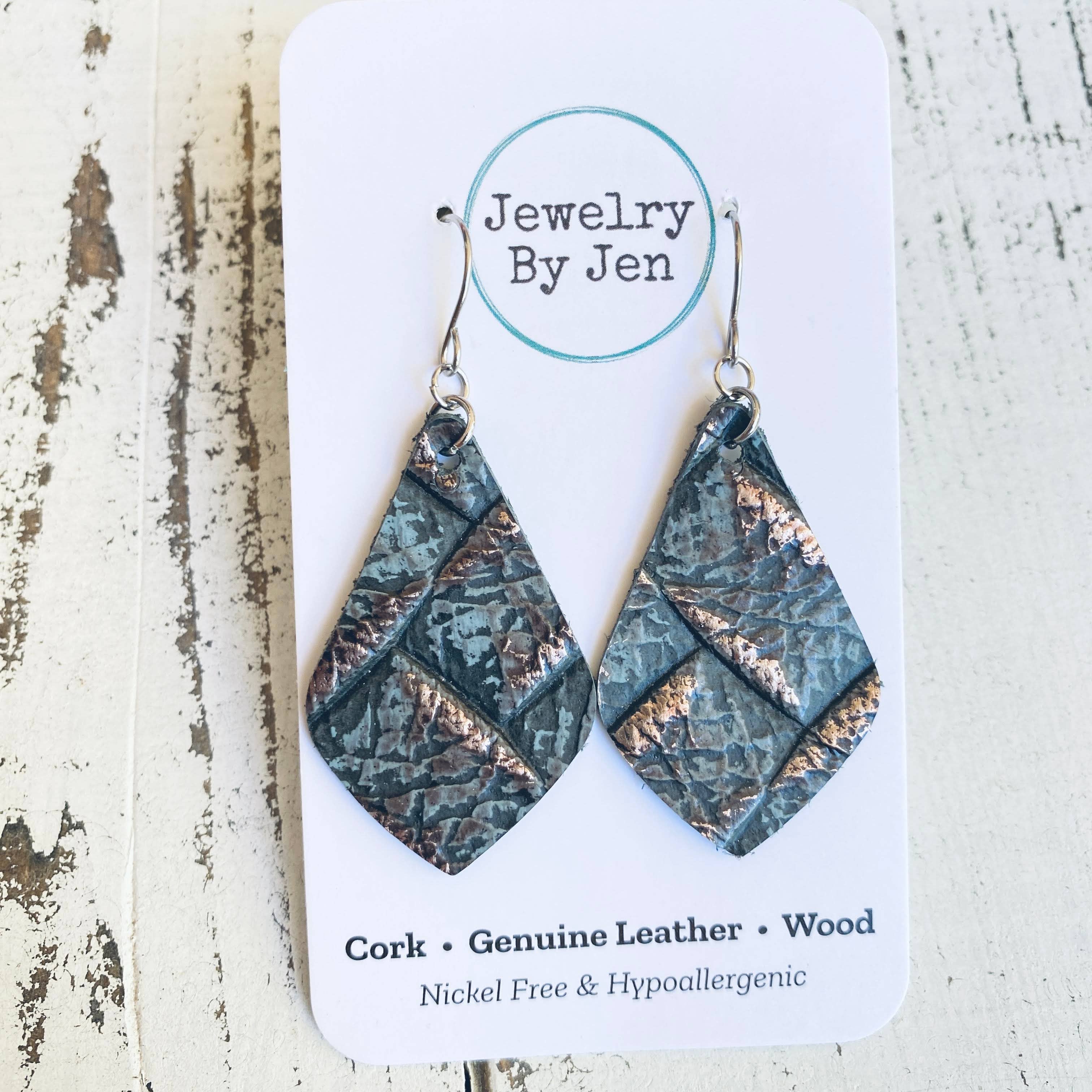 Measures 1.50 inches long. Antique Rose Gold Metallic on Blue Grey Textured Leather. Genuine leather. Stainless steel hook. Nickel free and hypoallergenic. Due to display settings on your device, colors may appear different.