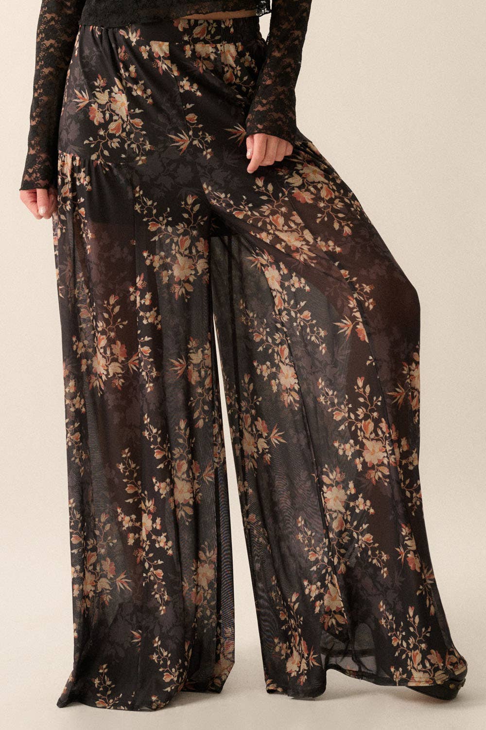 A pair of floral mesh woven pants with the following features: Elastic waistband. Wide leg. Ruffle hem. Thigh-length lining. Ankle length. Loose fit. * Black 2nd cut SOLD OUT. 3rd cut ETA: 9/30/2024. Model Info: Height: 5 ft 9 in | Bust: 32 in | Waist: 24 in | Hips: 36 in | Wearing Size S.