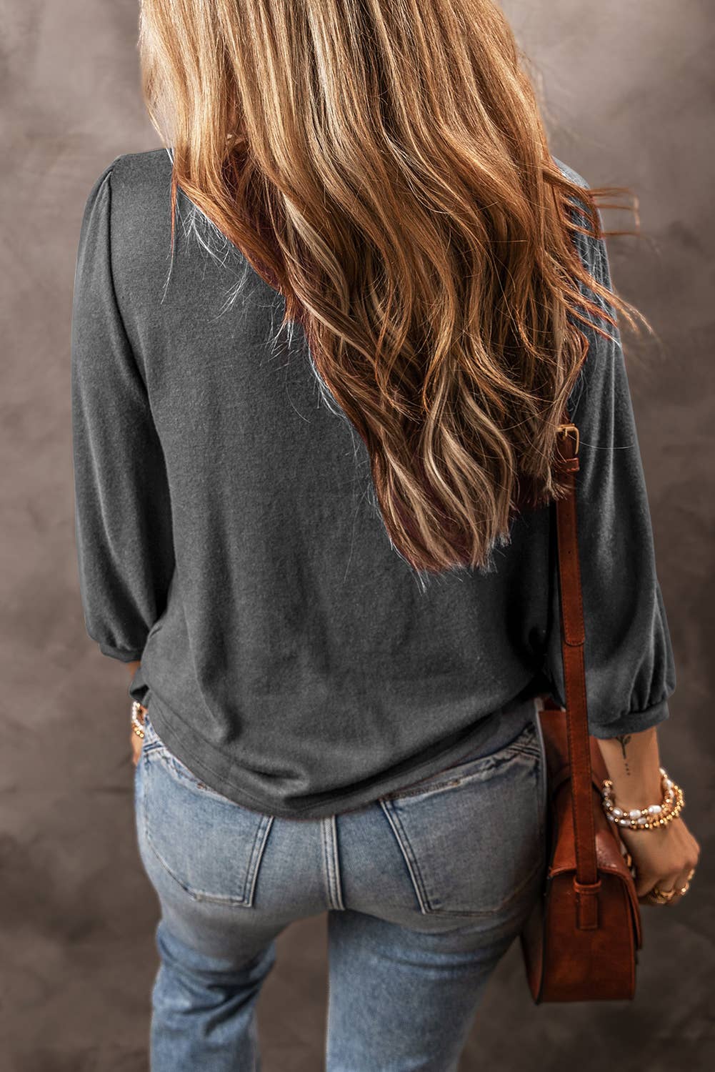 Solid Color 3/4 Sleeve Round Neck Top: Medium Grey / 95%Polyester+5%Elastane / M