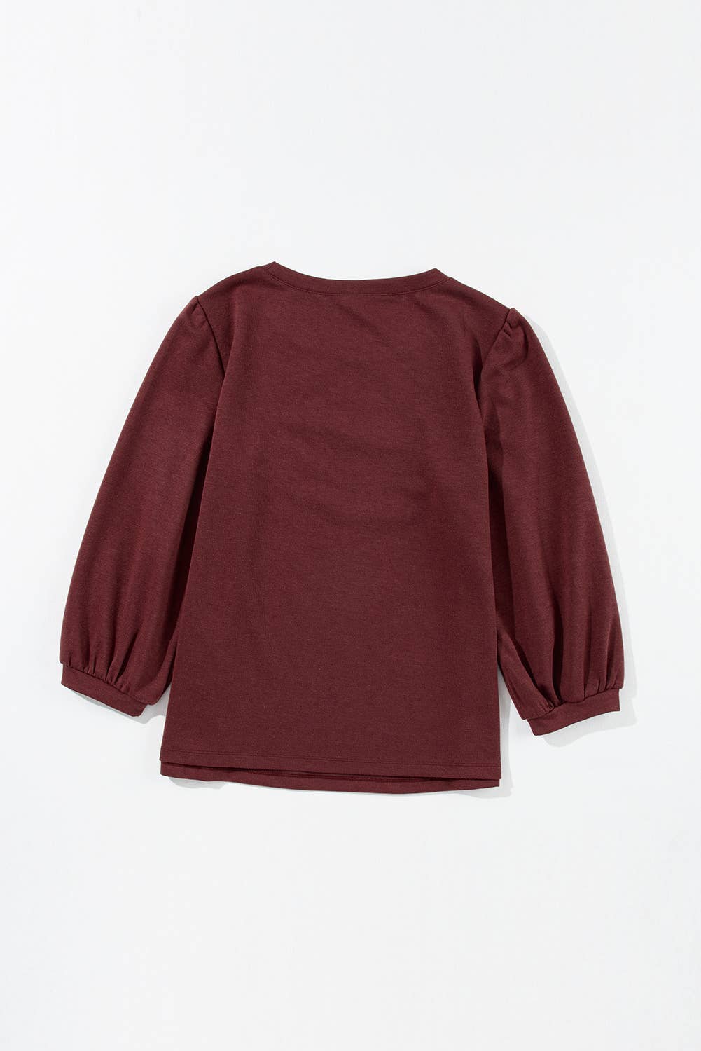 This solid color blouse is versatile and easy to style, making it a wardrobe essential Bracelet sleeves add a stylish and sophisticated touch, providing a flattering length The crew neckline offers a classic and timeless look, suitable for both casual and formal occasions Ruched detailing adds a subtle texture and visual interest, enhancing its overall charm Wholesale tops enhance your fashion game with diverse options