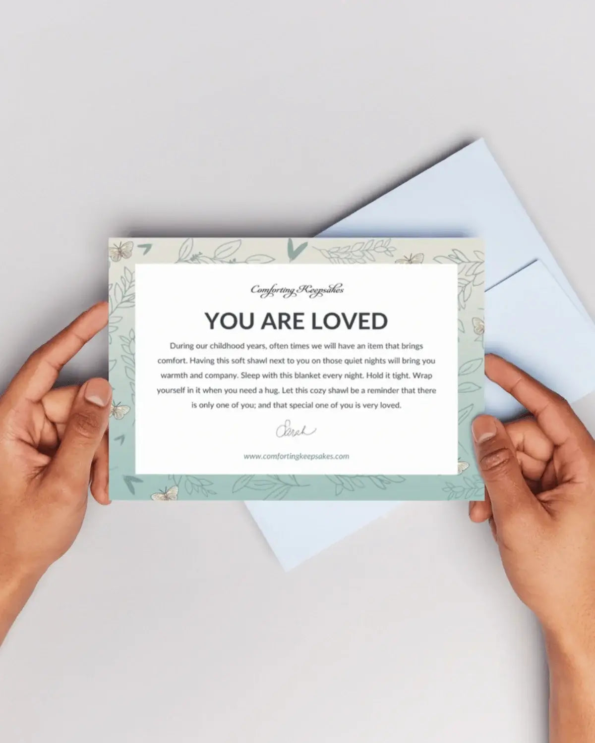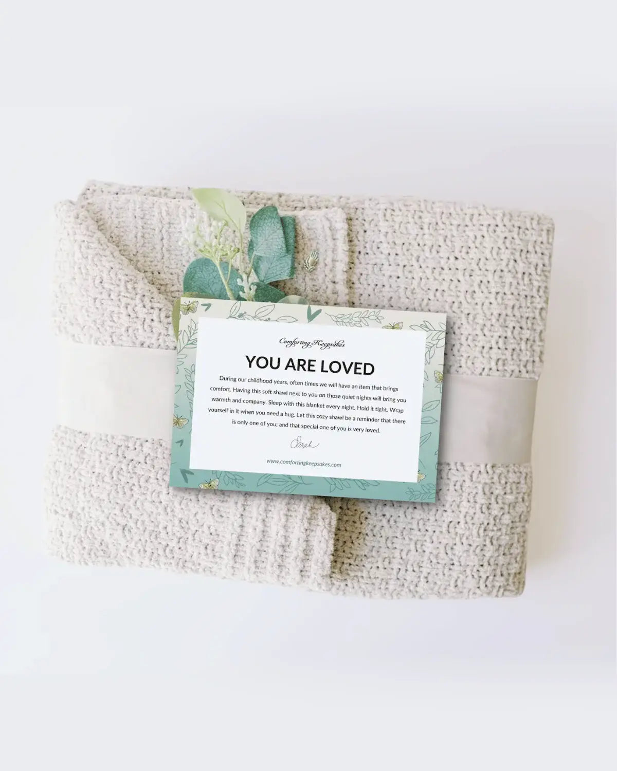 "YOU ARE LOVED: During our childhood years, often times we will have an item that brings comfort. Having this soft shawl next to you on those quiet nights will bring you warmth and company. Sleep with this blanket every night. Hold it tight. Wrap yourself in it when you need a hug. Let this cozy shawl be a reminder that there is only one of you; and that special one of you is very loved." Includes: ▫️ Oatmeal Knitted Chenille Prayer Shawl with Praying Hands Charm (30" x 60") ▫️Comforting Prayer Shawl description card ▫️Comforting Keepsakes Logo Ribbon wrapped shawl with butterfly logo hangtag